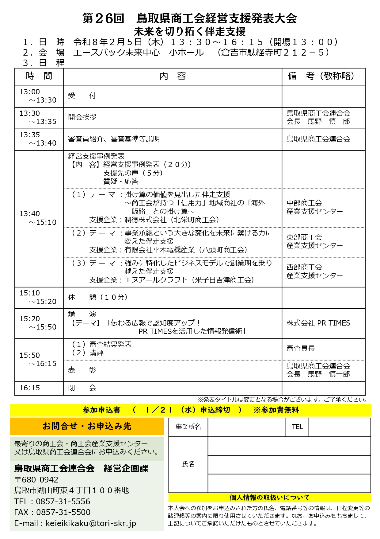 鳥取県商工会連合会では、「~未来を切り拓く伴走支援~」をテーマに、第26回経営支援発表大会を開催します。